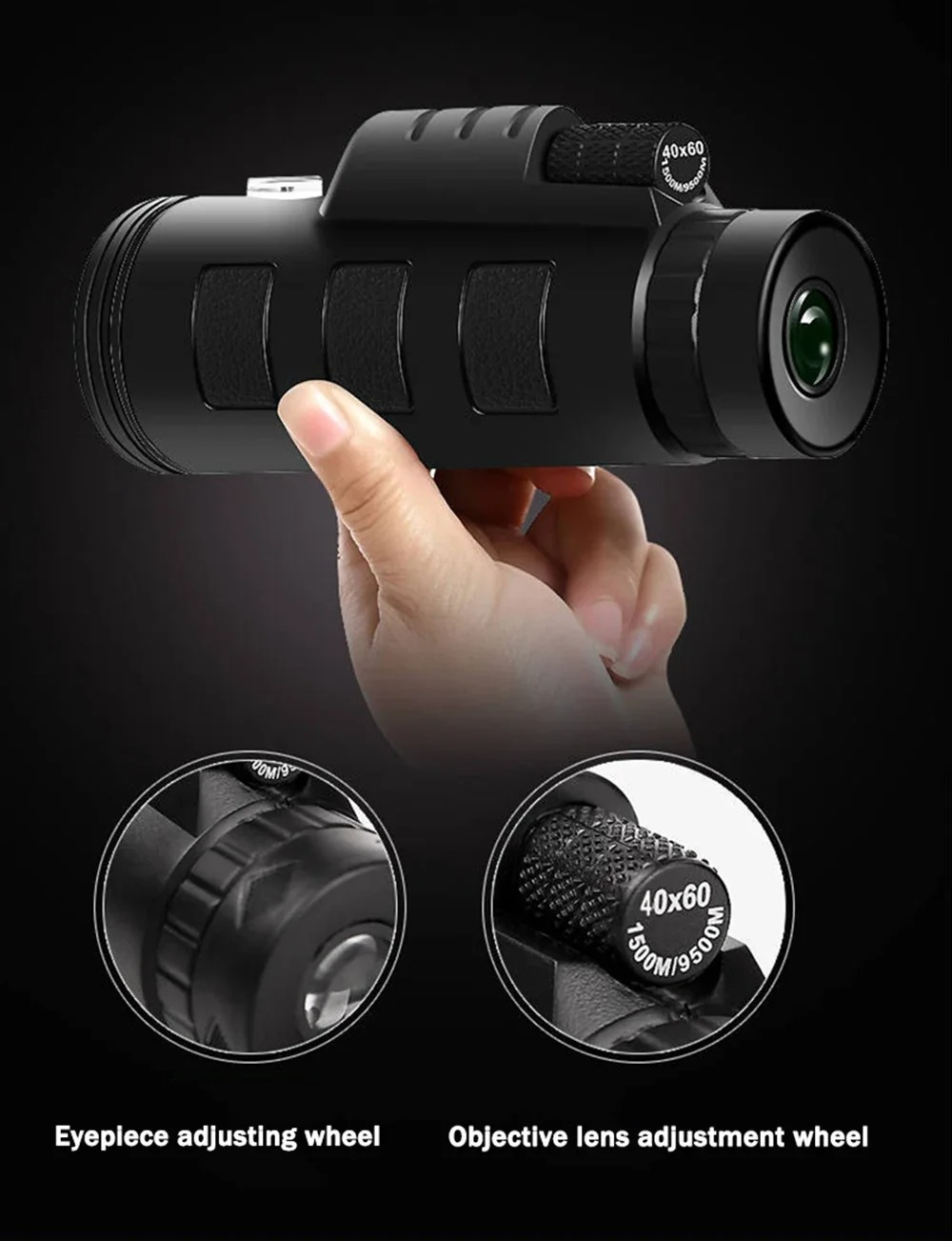 Materiales: El telescopio monocular 40x60 está fabricado con cuerpo recubierto de goma resistente que protege contra impactos y abrasiones, ofreciendo un agarre seguro y cómodo para actividades al aire libre.