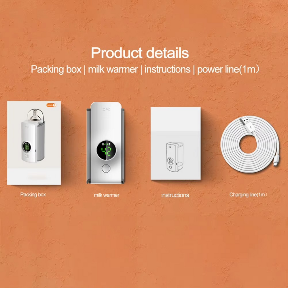 Contenido del paquete: Incluye caja de embalaje, calentador portátil para biberones, cable de carga USB de 1 metro y documentación del producto. El biberón no está incluido.