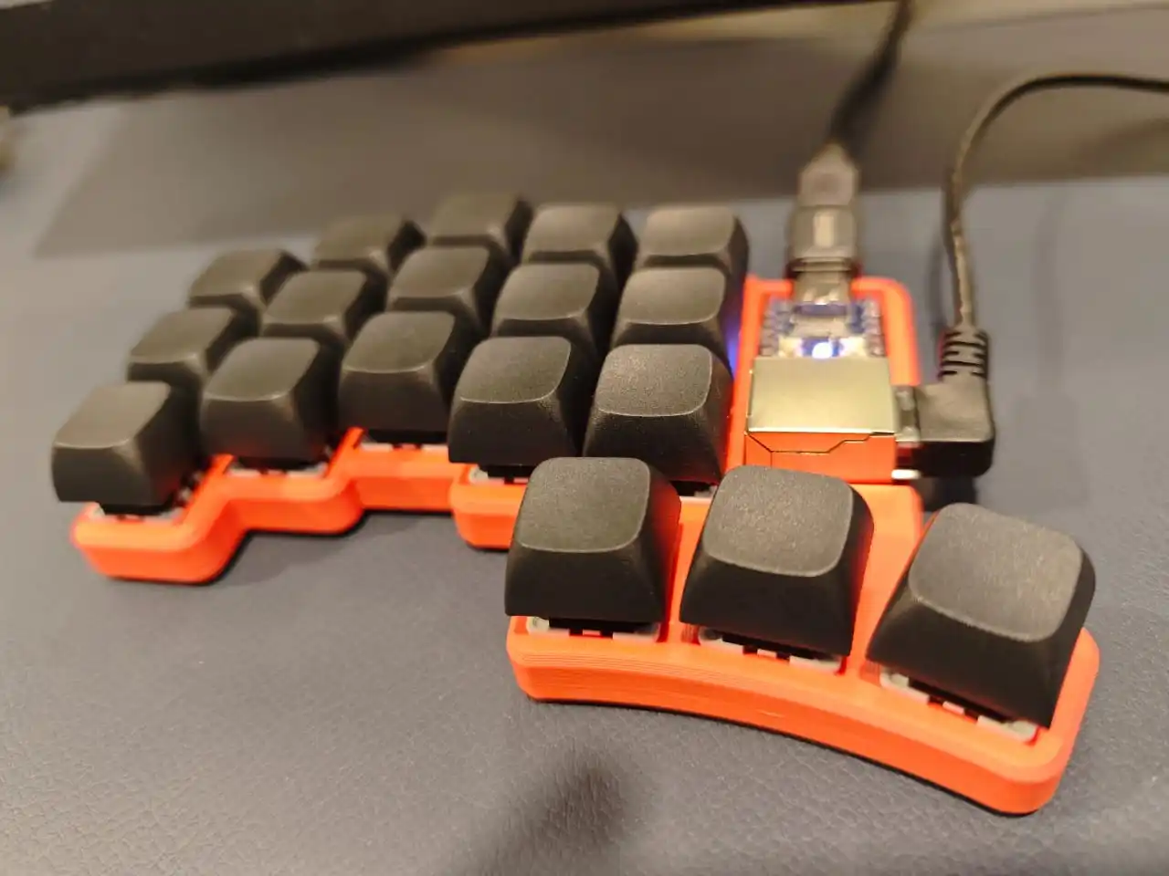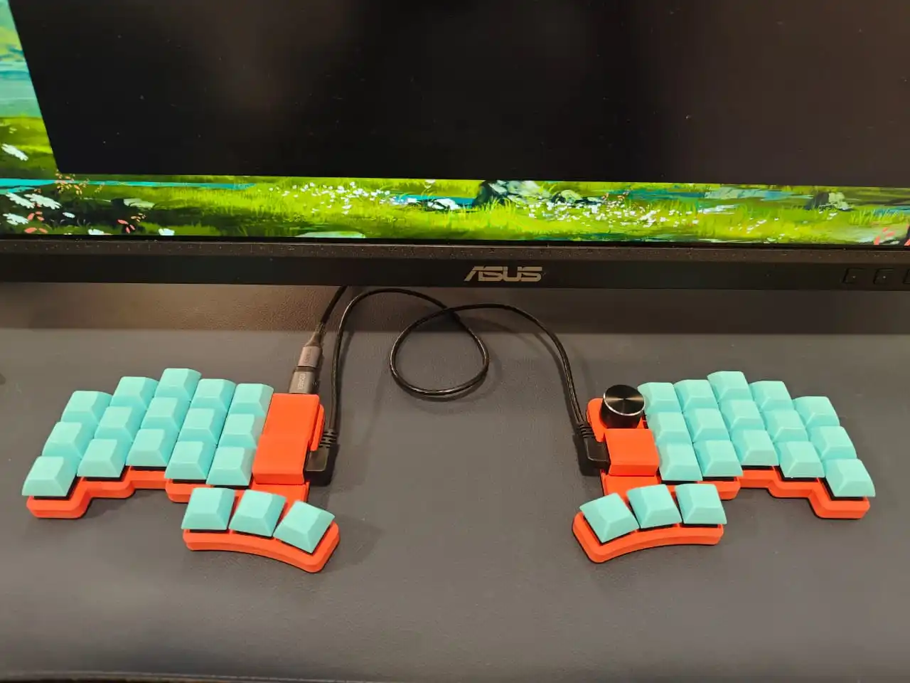 Materiales: El Teclado Dividido Cheapino V2 está fabricado con una carcasa de PLA mate impresa en FDM, ofreciendo una textura robusta y artesanal que aporta carácter y resistencia, manteniendo un acabado ligero y cómodo para el uso diario.